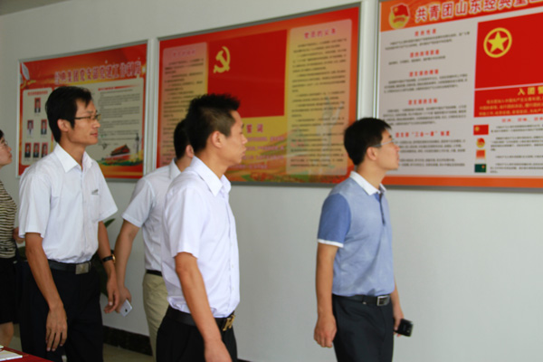 團(tuán)支部書記周超陪同濟(jì)寧團(tuán)市委書記鐘稱生等領(lǐng)導(dǎo)一同參觀團(tuán)支部活動(dòng)辦公室