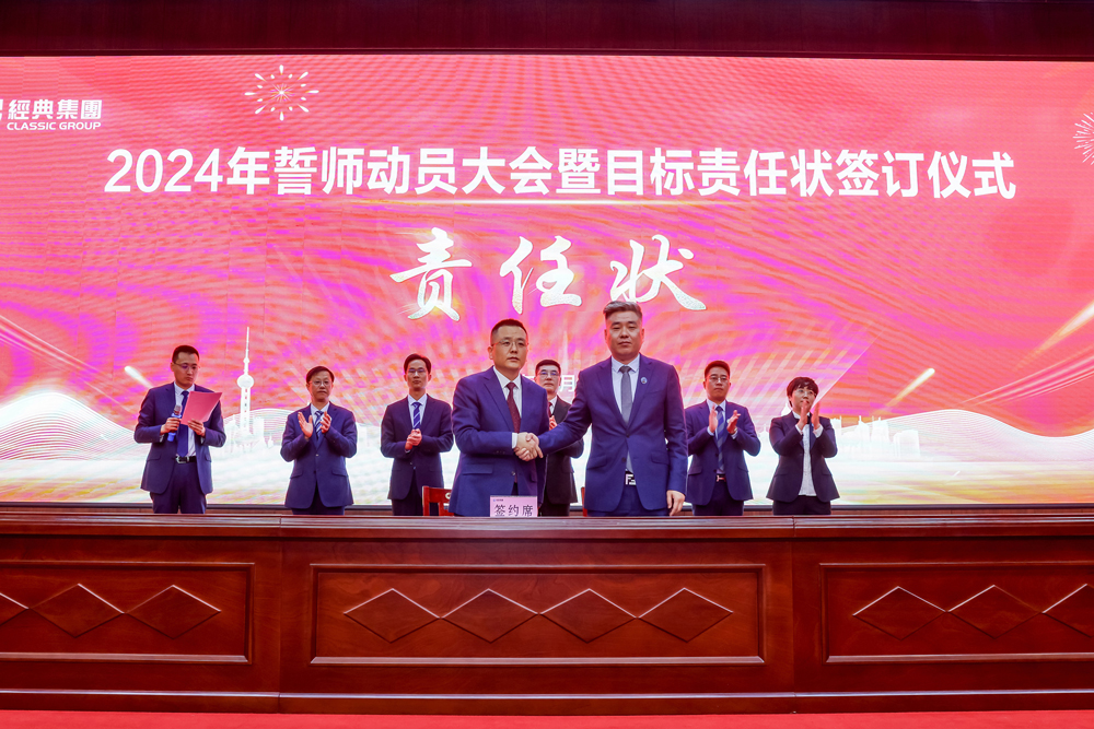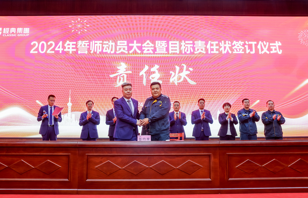 團(tuán)結(jié)凝聚力量,奮斗鑄就偉業(yè)。2月18日上午,經(jīng)典集團(tuán)2024年誓師動(dòng)員大會(huì)暨目標(biāo)責(zé)任狀簽訂儀式在職工會(huì)議中心成功召開,動(dòng)員集團(tuán)各部門錨定2024年各項(xiàng)目標(biāo)任務(wù),統(tǒng)一思想、凝心聚力,全力以赴抓好落實(shí),確保集團(tuán)高質(zhì)量發(fā)展再上新臺(tái)階。集團(tuán)董事會(huì)、集團(tuán)公司分管負(fù)責(zé)人、各單位負(fù)責(zé)人、工程項(xiàng)目經(jīng)理、各單位職工代表參加了會(huì)議。