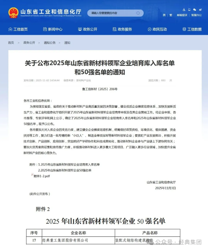 近日,山東省工業和信息化廳公布2025年山東省新材料領軍企業50強名單,經典重工集團股份有限公司憑借深厚的技術積淀、卓越的創新實力與廣泛的行業影響力,再度榮耀入選。這不僅是對集團在新材料領域持續深耕的權威肯定,更是推動產業高質量發展的有力印證。2025-11-07